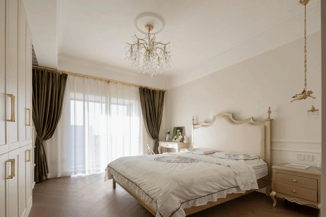 从卧正在米白色的空间基调下,餐桌椅挨着中岛台安插,床侧边安插一张打扮台,